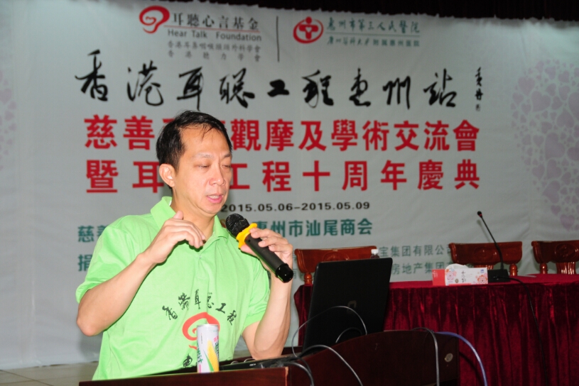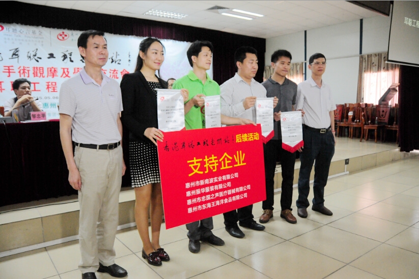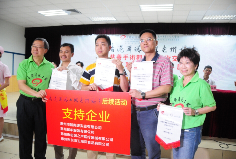 本次活動由香港“耳聽心言”基金會和惠州市第三人民醫(yī)院聯(lián)合舉辦,惠州市汕尾商會慈善捐助。當(dāng)日上午,惠城區(qū)委常委、區(qū)人大常務(wù)副主任陳娟同志,惠州市殘聯(lián)理事長曾建廷同志,惠城區(qū)衛(wèi)計局黨委書記、局長鄒忠平同志,惠州市衛(wèi)計局醫(yī)政科科長謝漢明同志,香港“耳聽心言”基金主席唐志輝教授,香港“耳聽心言”基金副主席鄧樹安醫(yī)生及基金會相關(guān)領(lǐng)導(dǎo),香港及國內(nèi)一流耳科專家(名單附后),惠州市慈善總會副秘書長曾煥添同志,汕尾商會執(zhí)行會長林文填先生及汕尾商會相關(guān)領(lǐng)導(dǎo)等領(lǐng)導(dǎo)嘉賓出席了“耳聰工程”惠州站啟動會議。來自中央電視臺衛(wèi)生頻道、中國新聞社、廣東電視臺珠江頻道、南方日報、南方都市報、惠州電視臺、惠州日報、東江時報、社會與公益雜志等多家媒體的記者朋友們也參與了本次活動。