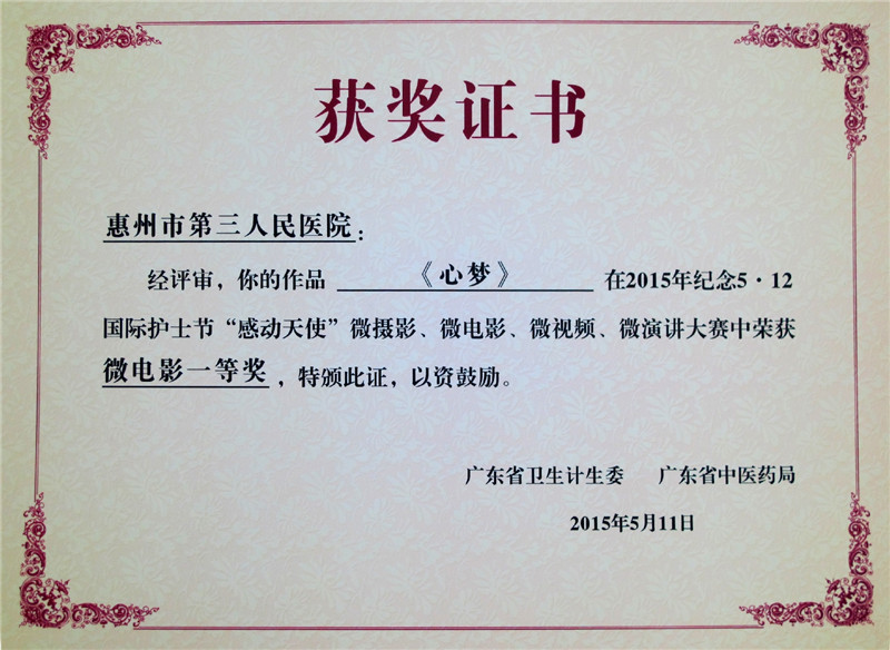 為慶祝2015年“512”國(guó)際護(hù)士節(jié),廣東省衛(wèi)計(jì)委日前在全省醫(yī)療系統(tǒng)中開(kāi)展了“感動(dòng)天使,講述你身邊的故事”微攝影、微電影和微演講大賽,惠州市第三人民醫(yī)院選送的微電影作品《心·夢(mèng)》從近230部參賽作品中脫穎而出,獲得本次微電影大賽的一等獎(jiǎng)!同時(shí)選送的微演講比賽作品也獲得了三等獎(jiǎng)的好成績(jī)。