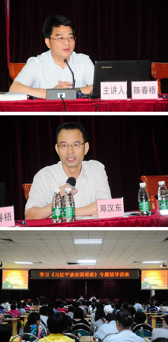 講座上,陳春梧副校長以“淺談習(xí)近平治國理政‘十大亮點’”為主題,圍繞習(xí)近平總書記治國理政思想,從“點燃中國夢”、“改革動作猛”、“法治氛圍濃”、“經(jīng)濟穩(wěn)中行”、“美麗中國現(xiàn)”、“神州促和諧”、“打虎拍蒼蠅”、“筑牢新長城”、“外交風(fēng)骨硬”、“實施八規(guī)定”等十大亮點,對以習(xí)近平總書記為核心的黨中央的治國理政方略進行了全面的解讀。