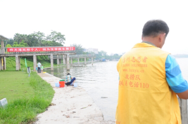 志愿者提醒此刻東江里游泳的市民們注意安全