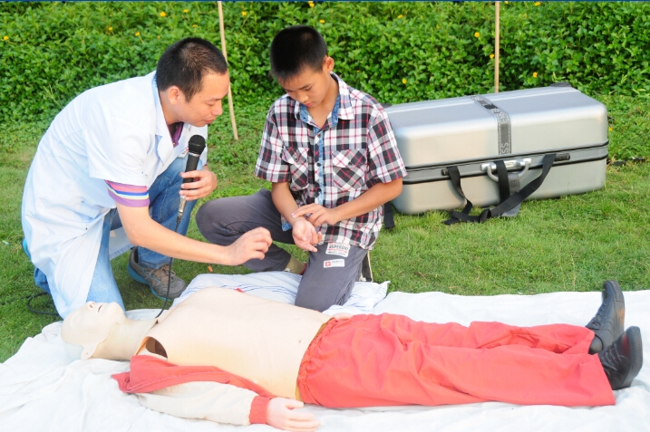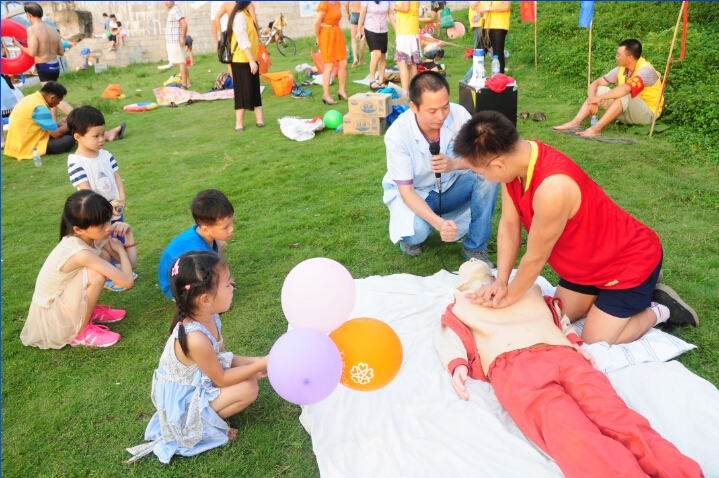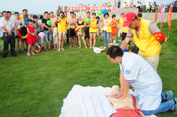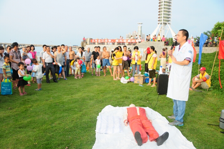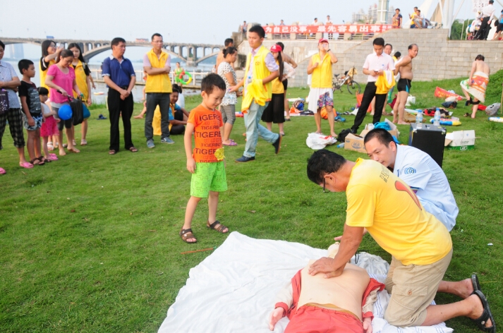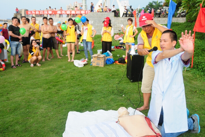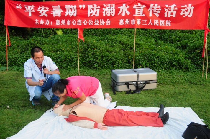 惠州市志愿救撈隊(duì)隊(duì)長趙喜昌介紹了惠州今年以及往年游泳溺亡情況,呼吁大家必須重視游泳安全,提醒大家游泳決不能單獨(dú)一人,必須要用好的同時系著安全繩的游泳圈,會游泳的更不能掉以輕心忽視安全等等。隨后惠州市第三人民醫(yī)院急診科林月雄醫(yī)生教現(xiàn)場的市民群眾如何根據(jù)溺水者的不同狀況進(jìn)行施救,并讓他們體驗(yàn)了如何正確進(jìn)行心肺復(fù)蘇搶救溺水者和患者。