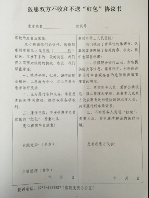 我院秉著以病人為中心的精神,嚴(yán)格執(zhí)行國(guó)家衛(wèi)生計(jì)生委、國(guó)家中醫(yī)藥管理局制定的《加強(qiáng)醫(yī)療衛(wèi)生作風(fēng)建設(shè)“九不準(zhǔn)”》制度,要求醫(yī)生在病人入院24小時(shí)內(nèi),與病人簽署一份“醫(yī)患雙方不收和不送‘紅包’協(xié)議書(shū)”。協(xié)議內(nèi)容表明:醫(yī)護(hù)人員將秉持平等、仁愛(ài)、誠(chéng)信的職業(yè)精神,以患者為中心,盡心盡責(zé)為患者治療疾病,并在治療過(guò)程中,廉潔行醫(yī),不接受患者其家屬的“紅包”及貴重禮品。并要求病人在詳細(xì)閱讀協(xié)議書(shū)后承諾在就診過(guò)程中,不向醫(yī)護(hù)人員送“紅包”及貴重禮品,共創(chuàng)廉潔和諧的醫(yī)療環(huán)境。醫(yī)院黨委辦會(huì)不定期進(jìn)行明察暗訪,對(duì)于不嚴(yán)格執(zhí)行的科室,醫(yī)院將給予相應(yīng)的處罰。