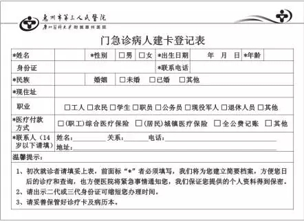 1)《門急診病人建卡登記表》需填寫完整,尤其帶*符號(hào)的內(nèi)容,我們將為患者建立簡(jiǎn)要檔案,以便日后的診療和查詢,也方便緊急聯(lián)系。