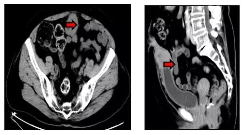 本例患者不是男性而是71歲女性,因“臍部溢液并下腹部紅腫硬塊”前來就診,之前也曾到過醫(yī)院但并未引起足夠的重視。家屬找到楊偉忠主任醫(yī)師后,經(jīng)仔細(xì)詢問病史并檢查病人,楊主任馬上診斷是臍尿管的慢性病變,并且高度懷疑腫瘤的可能性。立即給予下腹CT檢查報(bào)告為:“下腹部正中線區(qū)域臍-膀胱頂部之間軟組織腫塊影,性質(zhì)待定:臍尿管腫瘤?炎癥性病變?(見下圖)”。