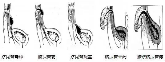 臍尿管異常是一類先天性畸形,病因不明,多見于男性,發(fā)病率極低約只有1/30萬。臨床表現(xiàn)為臍部分泌物或尿液流出,易合并感染,可出現(xiàn)膀胱刺激征。按病情由輕到重如下圖所示可分5種類型,如長(zhǎng)期未處理均可發(fā)生癌變,一經(jīng)發(fā)現(xiàn)就應(yīng)盡早手術(shù)切除。