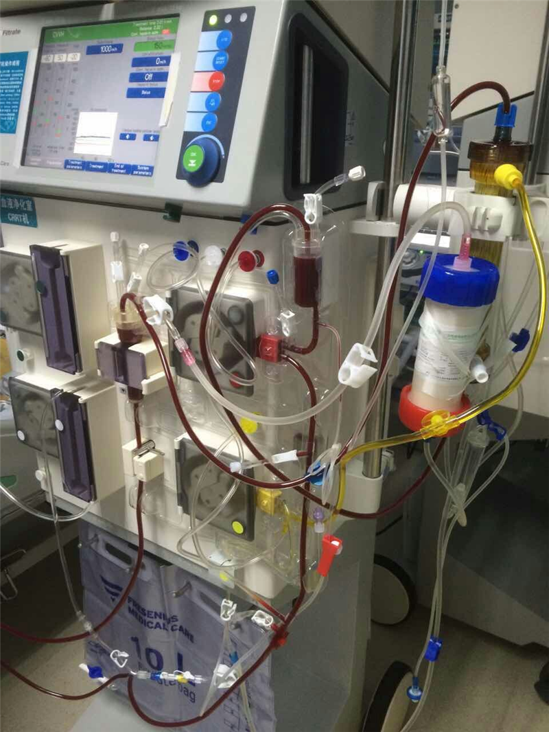 當天腎內(nèi)科接到ICU會診通知,一位女性患者,診斷為右腎膿腫、膿毒血癥,多器官功能衰竭,患者因肝功能衰竭,需行人工肝治療,接到通知后,腎內(nèi)科姚筱主任提出在行持續(xù)床旁血濾基礎上為病人實施血漿置換聯(lián)合血漿膽紅素吸附術。在征得患者家屬同意后,簽署知情同意書,隨即為病人治療。