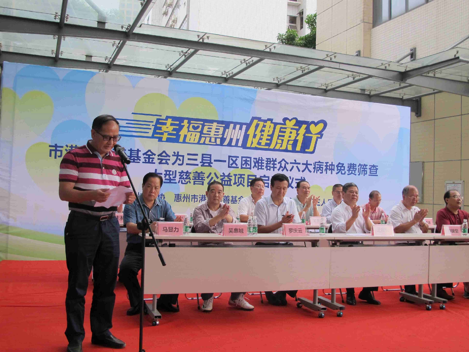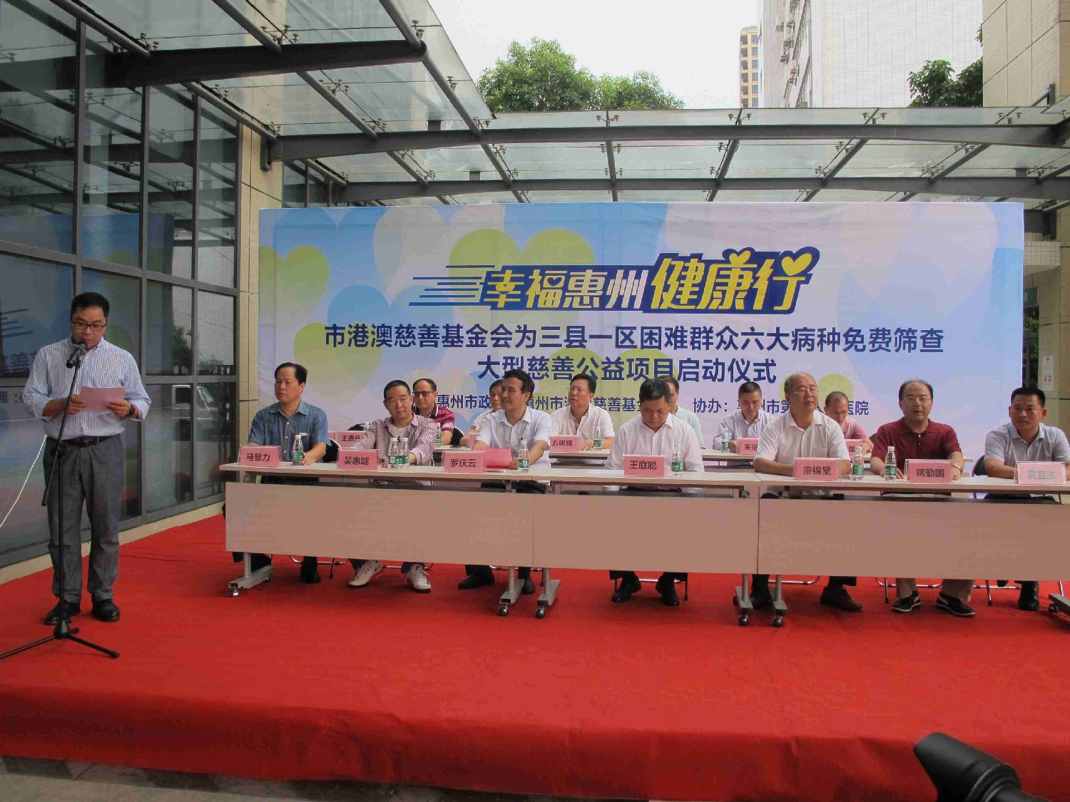 2016年9月23日下午,“幸?;葜萁】敌小贝笮凸骓?xiàng)目啟動(dòng)儀式在市第三人民醫(yī)院東院區(qū)舉行,市政協(xié)領(lǐng)導(dǎo)、市政協(xié)港澳委全體委員及各縣區(qū)篩查單位領(lǐng)導(dǎo)參加了啟動(dòng)。該項(xiàng)目由市港澳慈善基金會(huì)率先發(fā)起,在惠州市政協(xié)的共同牽頭下,聯(lián)合市第三人民醫(yī)院、博羅縣人民醫(yī)院、惠東縣人民醫(yī)院、龍門縣人民醫(yī)院為惠州市三縣一區(qū)的困難群眾開(kāi)展六大病種(白內(nèi)障、先天性心臟病、高血壓、糖尿病、甲狀腺疾病、育齡婦女兩癌)的免費(fèi)篩查,助力建設(shè)健康惠州。