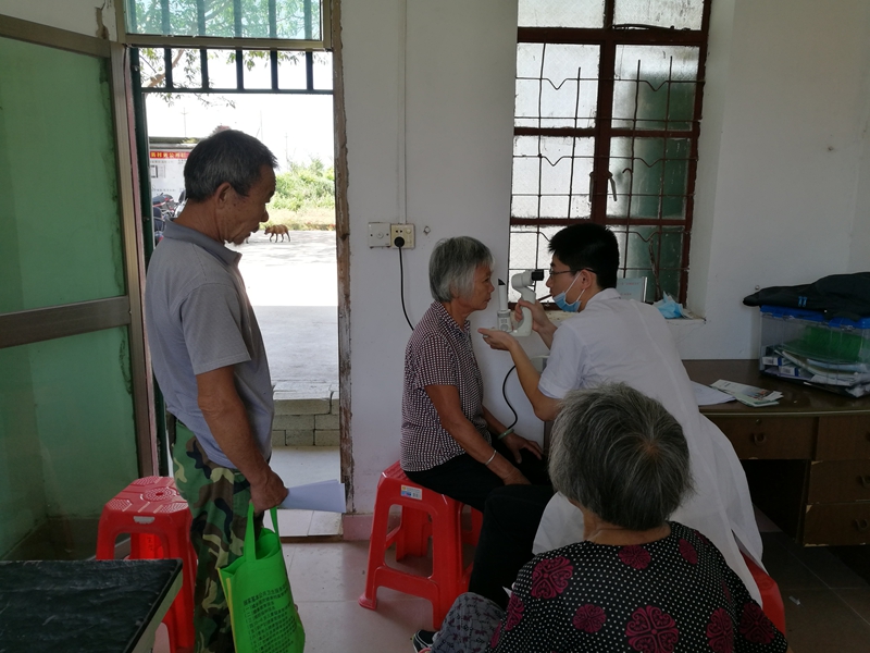 三洲村總?cè)丝趦汕в嗳?,以農(nóng)業(yè)人口為主,當(dāng)?shù)卮迕駥ρ獕?、血糖等相關(guān)知識十分缺乏。本次義診邀請三洲村65歲及以上的常住居民前來參加,地點設(shè)在三洲村村委會。義診團(tuán)隊為老人們提供生活方式和健康狀況評估、體格檢查、量血壓、測血糖、心電圖、白內(nèi)障篩查、骨病篩查等輔助檢查,并綜合??茖<业慕ㄗh,提出健康指導(dǎo)。