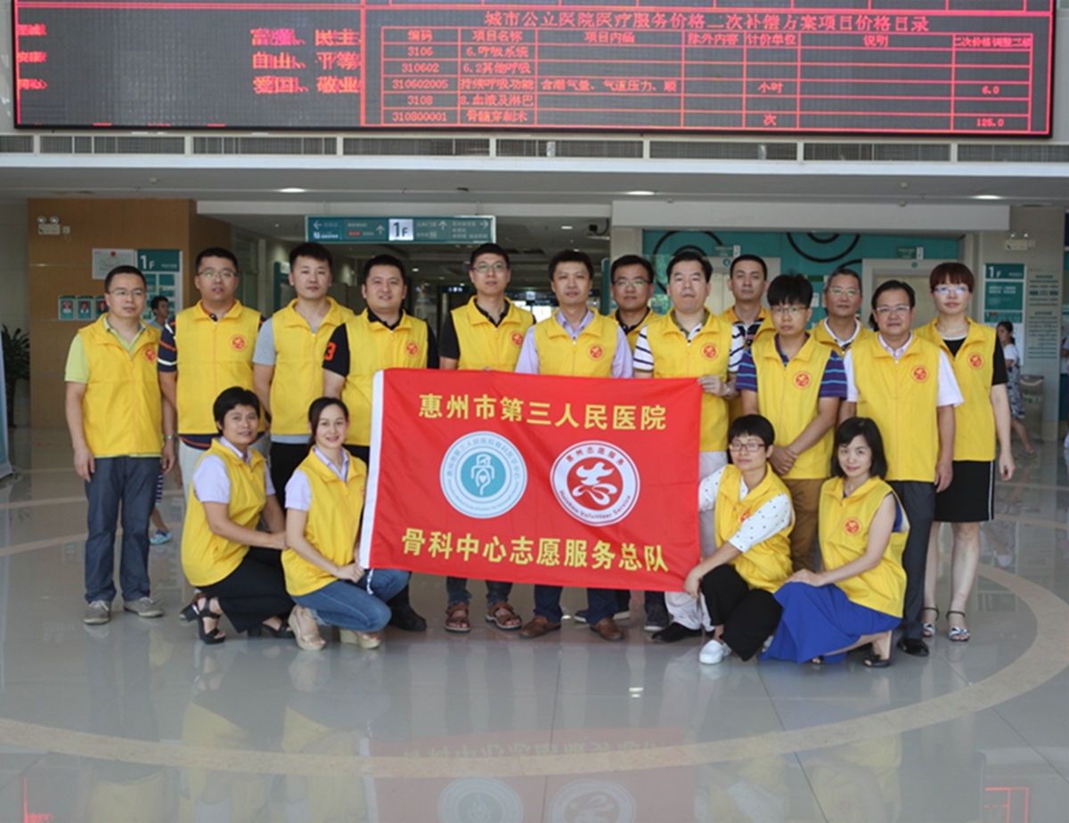 2017年6月20日,惠州市第三人民醫(yī)院骨科醫(yī)學(xué)中心成立骨科中心志愿服務(wù)總隊(duì),惠州市第三人民醫(yī)院院長(zhǎng)業(yè)務(wù)助理、骨科醫(yī)學(xué)中心主任、學(xué)科帶頭人,主任醫(yī)師,骨科學(xué)博士武明鑫教授為團(tuán)隊(duì)負(fù)責(zé)人,服務(wù)總隊(duì)本著“學(xué)習(xí)雷鋒、奉獻(xiàn)他人、提升自己”的志愿服務(wù)理念,以“奉獻(xiàn)、友愛、互助、進(jìn)步”的志愿精神作為服務(wù)宗旨,致力于在惠州市地區(qū)內(nèi)及市以外開展骨科專業(yè)特色志愿服務(wù)活動(dòng),為百姓健康服務(wù)。