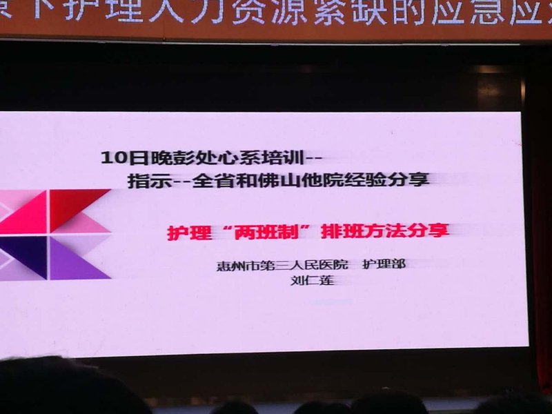 2017年8月10日,兩班制排班方法在深圳市護(hù)理學(xué)會(huì)舉辦的《二孩政策背景下護(hù)理人力資源緊缺的應(yīng)急應(yīng)對(duì)管理培訓(xùn)班》上,經(jīng)省衛(wèi)計(jì)委彭剛藝處長指示,進(jìn)行了經(jīng)驗(yàn)交流和分享。