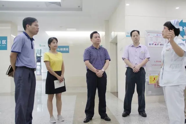 市衛(wèi)計局嚴(yán)戈科局長(中)、市衛(wèi)計局周麗副局長(左二)、惠城區(qū)衛(wèi)計局鄒忠平局長(左一)、市三院馬顯力院長(右二)聽取急診科護(hù)長介紹工作