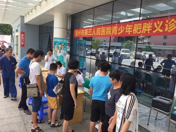 2017年8月24日,為了幫助青少年肥胖患者安全有效減重,通過專業(yè)醫(yī)生的診療,在保證營養(yǎng)充足的前提下達到健康有效減輕體重?;葜菔械谌嗣襻t(yī)院組織內(nèi)分泌科及營養(yǎng)科專家志愿者在門診一樓開展義診活動,為肥胖患者免費內(nèi)分泌代謝評估、免費血糖檢測、免費體脂檢測、營養(yǎng)代謝咨詢。