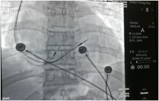 手術(shù)當(dāng)天,楊飛副主任醫(yī)師與鐘思干主任沉著冷靜、有條不紊實(shí)施著手術(shù),首次嘗試就成功穿刺腋靜脈,順利置入血管鞘,沿鞘管送入3830主動(dòng)電極至房室交界處房側(cè),順利找到his電位。