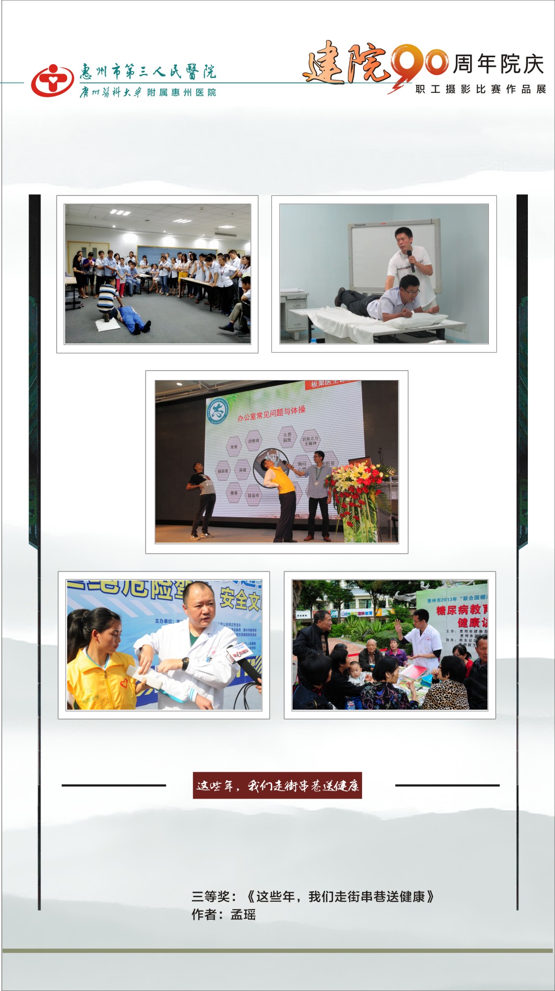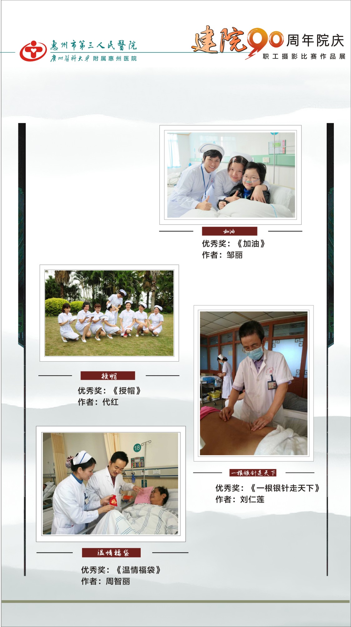為慶祝90周年華誕,惠州市第三人民醫(yī)院于近期舉辦了院慶系列活動。其中,升旗儀式、學術(shù)活動周以及系列義診等活動的開展已獲得廣泛好評。而在上個月舉辦的職工書畫攝影比賽中,大批優(yōu)秀的作品如泉涌現(xiàn),充分展現(xiàn)出惠州三院職工人員的文藝風采!