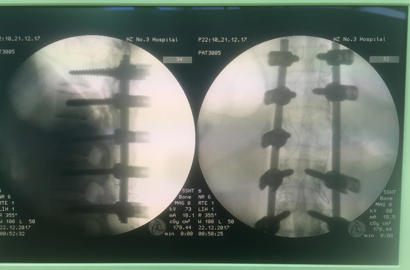 在手術(shù)過程中,醫(yī)生們發(fā)現(xiàn)傷者的胸12椎體爆裂骨折、對應(yīng)的脊髓斷裂,胸11椎體IV度脫位。武明鑫博士為傷者完成了胸腰段后路骨折復(fù)位、椎管減壓、椎弓根螺釘內(nèi)固定術(shù),解除了脊髓神經(jīng)受壓,恢復(fù)了脊柱的力學(xué)穩(wěn)定,為其神經(jīng)恢復(fù)創(chuàng)造良好的條件。