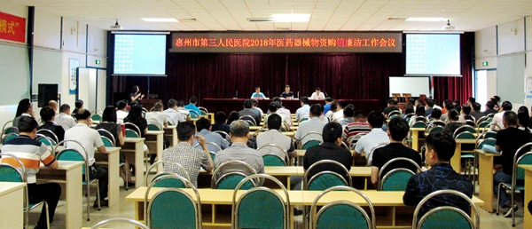 2018年4月24日下午,惠州三院召開醫(yī)藥器械及后勤物資購(gòu)銷廉潔工作會(huì)議,醫(yī)院黨委鄧漢東書記、區(qū)紀(jì)委派駐區(qū)衛(wèi)計(jì)局紀(jì)檢組楊煥長(zhǎng)組長(zhǎng)、相關(guān)職能科室主任及醫(yī)藥、器械及后勤物資供應(yīng)商代表參加會(huì)議。會(huì)議由醫(yī)院黨委李瑞林紀(jì)檢委員主持。