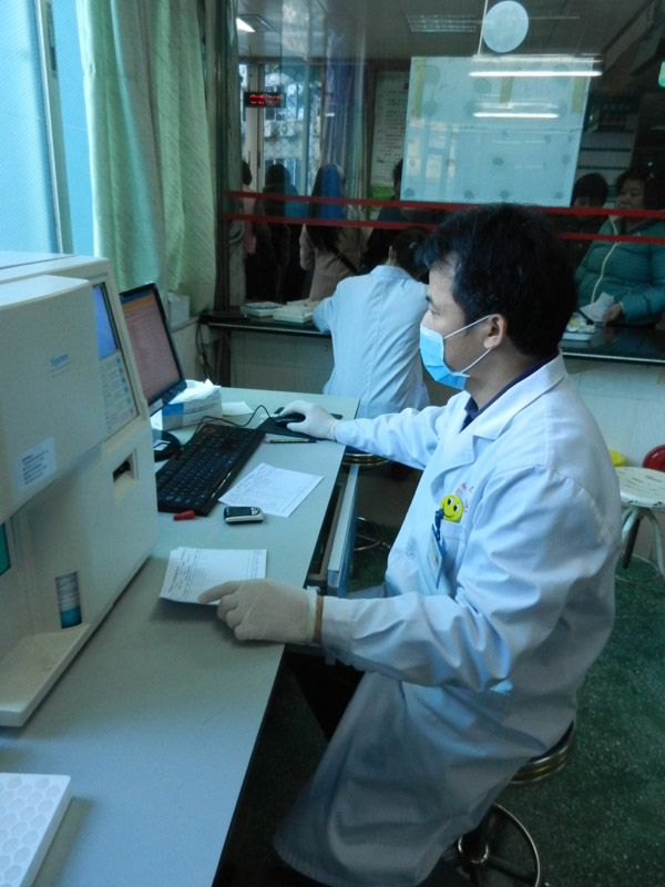 “陳組長,還沒下班啊”?交接完夜班后,已經(jīng)是晚上六點(diǎn)了,我看見他還在埋頭維修著儀器。旁邊的同事接上話說:“今天早上儀器壞了,組長他一直修到現(xiàn)在,中午飯還沒吃呢!”聽了頓時(shí)心里一震,晚飯時(shí)間都到了,中午飯還沒吃,我說再忙也要吃飯啊。他皺了皺眉頭說:“儀器有故障、只有快點(diǎn)把儀器修好,及時(shí)把報(bào)告單發(fā)出去才不會耽誤病人看病。”