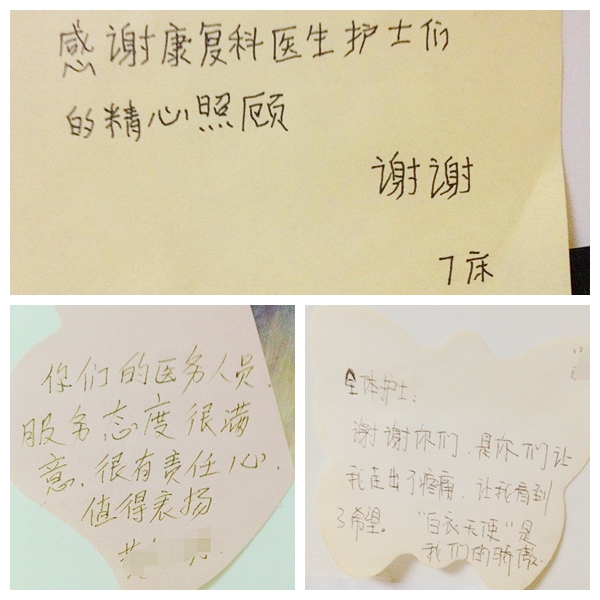 患者認為我們做得很好了,我們就要做得更好。只有真心的付出就會有美好的收獲,病人的滿意就是我們的追求。每當看到病友們滿意的回家時,醫(yī)務人員都無比的欣慰。病友們小小的便利貼,那是對于我們康復醫(yī)務人員的認可和贊許,也是我們醫(yī)患關系的標志。感動服務,讓患者驚喜的境界就是要創(chuàng)造超過患者的期望。