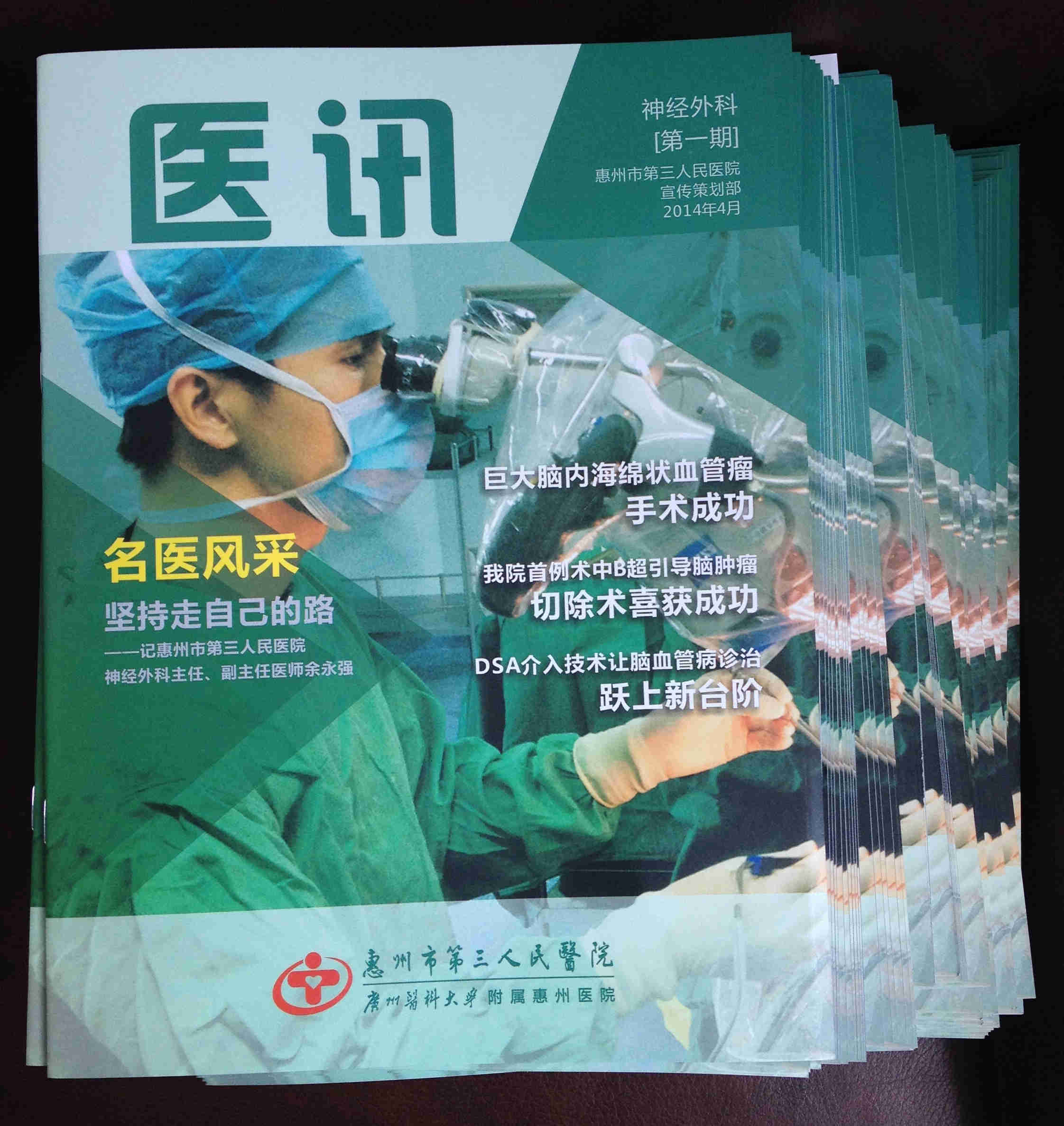 借鑒國內(nèi)名醫(yī)院名??频某晒π麄鞣椒ǎ以荷窠?jīng)外科提出創(chuàng)辦一本科級雜志的想法,立即得到了宣傳策劃部的積極響應和大力支持。該雜志完全由我院神經(jīng)外科供稿,主要精選神經(jīng)外科近期的優(yōu)秀宣傳稿件,在宣傳策劃部的精心編輯策劃下,制作成一本圖文并茂的??菩麄麟s志。通過這本雜志,讓更多的病友和同道了解我院神經(jīng)外科,提高科室技術品牌的知名度。