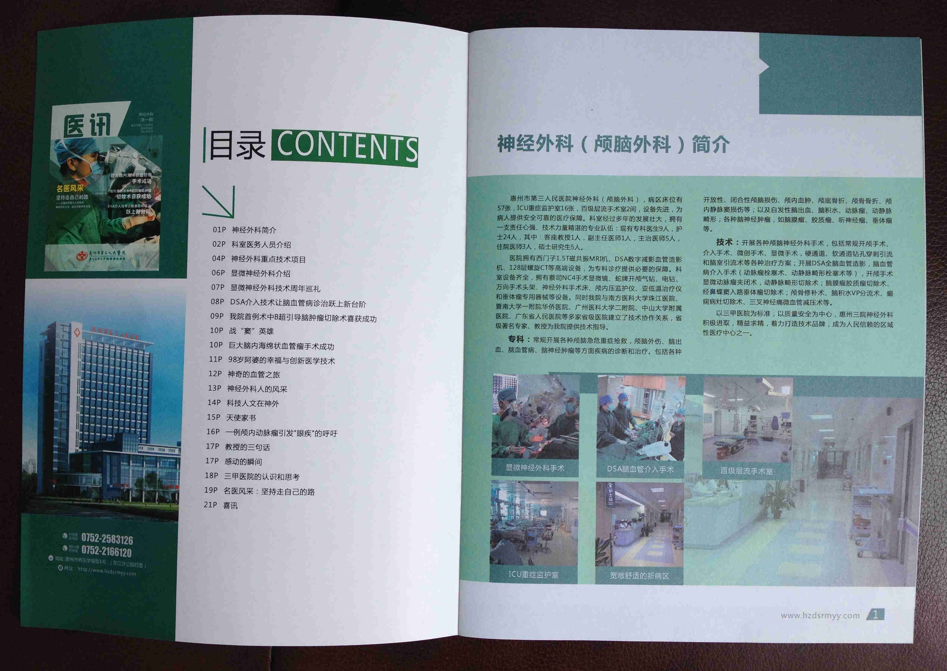 雜志作為一種更大容量的傳謀,更全面地宣傳介紹科室的專家人才、技術業(yè)務。通過科室、技術、人文等三大塊內(nèi)容共20篇文章,從各個角度詳實地展現(xiàn)了神經(jīng)外科人的敬業(yè)、專注、人文和科技進步。在雜志里,可以看到科室的技術介紹;看到神經(jīng)外科人付出的的辛勞汗水,以及“務實、進取、創(chuàng)新”的專業(yè)精神;看到神經(jīng)外科專業(yè)技術的進步,一個個的首例和首次,是一個個前進的腳印,是“更精湛、更有效、更安全”的工作目標的體現(xiàn)。