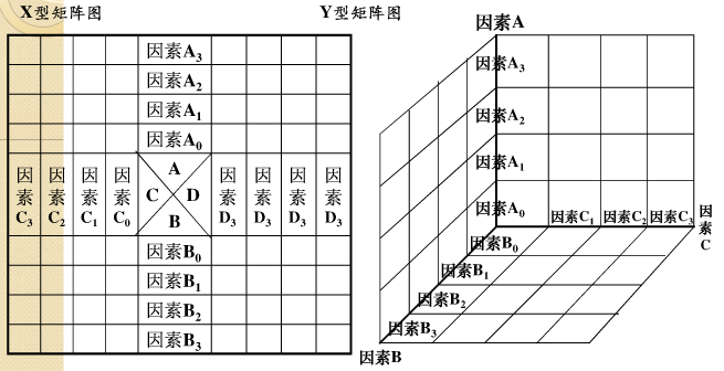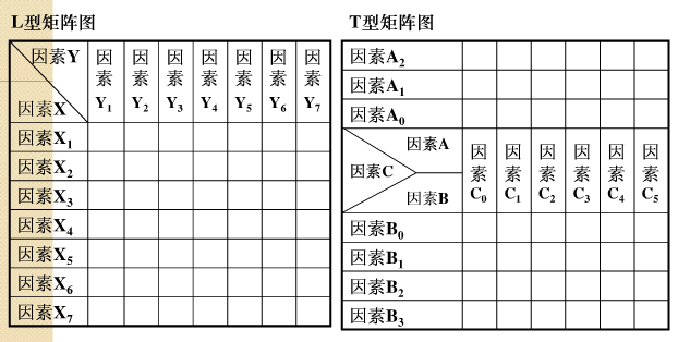 手法五:矩陣圖,是將與問(wèn)題有關(guān)的因素分別配置于“行”與“列”,利用因素與因素的交點(diǎn)來(lái)了解彼此間是否有關(guān)聯(lián)及關(guān)聯(lián)程度,然后借助交點(diǎn)有效解決問(wèn)題的方法。分為L(zhǎng)型、T型、X型、Y型四個(gè)類(lèi)型。
