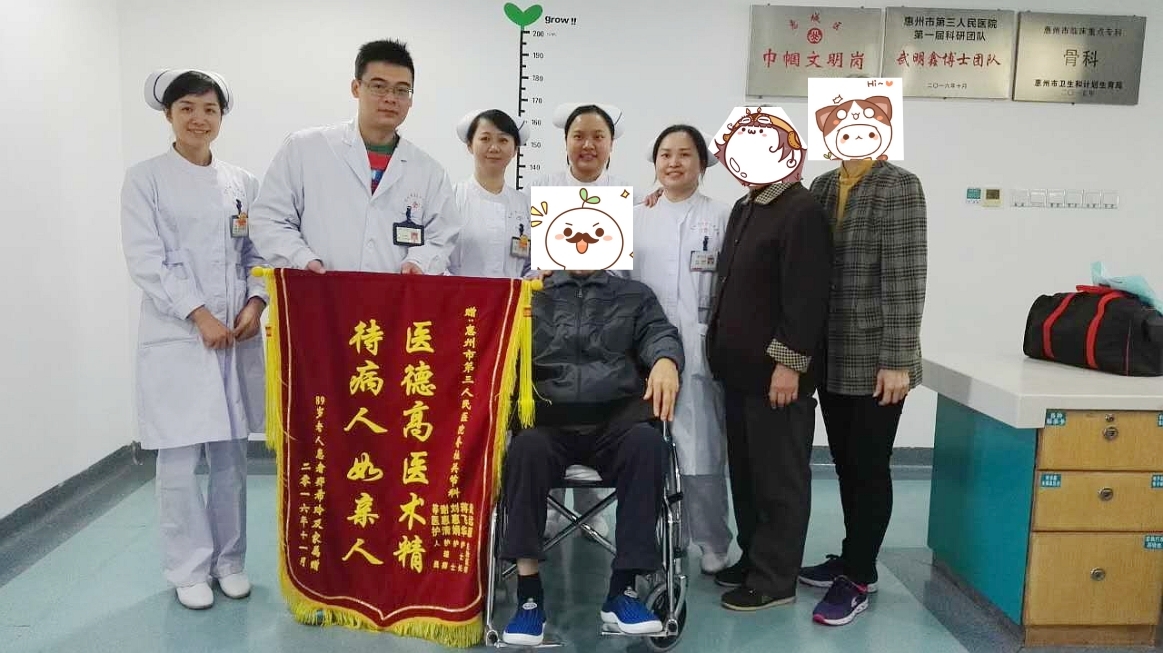 2016年12月5日上午,凌亂的腳步中摻著歡暢的笑聲。交握的十指,傾注全部的力量,這種力量相互在十指貫穿流動,他握著天使的手說:是你們陪我走過這段短暫而卻漫長的道路!他將一面火紅底印著“醫(yī)德高醫(yī)術(shù)精,待病人如親人”兩行金色字的錦旗,親手贈送給脊柱關(guān)節(jié)科的醫(yī)護人員……
