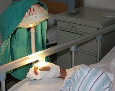 三、轉(zhuǎn)運時應(yīng)將病員不完全斷指(肢)用木版固定,并要注意運輸途中,傷員保持平臥抬高傷指(肢)。