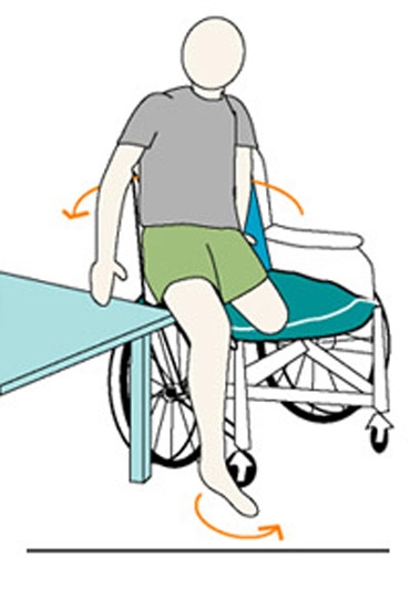③以好腳為中軸站在地上支撐身體,一手扶床邊,一手扶輪椅扶手,帶動身體移向輪椅坐下。