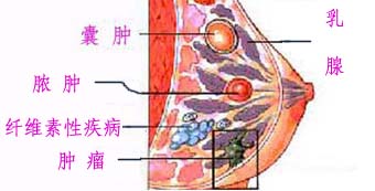 乳腺囊腫可發(fā)生于各個年齡段女性,一般中年多見。臨床上主要表現(xiàn)是乳房內(nèi)腫物。其病因是乳腺小葉及乳腺導(dǎo)管增生擴張,導(dǎo)致乳腺導(dǎo)管扭曲,滲液淤積,形成囊性腫物。部分患者因哺乳期乳腺腺葉的乳汁排出不暢,致使乳汁在乳內(nèi)積存而成積水、積乳囊腫。