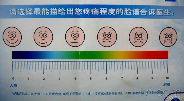 它的評(píng)估方法有兩種,第一種是臉譜法:適合一些理解能力較低的人群,測試者可以根據(jù)自己的疼痛感受去指出相對(duì)應(yīng)表情的臉譜。第二種方法是數(shù)字法:疼痛數(shù)值有0分-10分,0分:無痛;3分以下:有輕微的疼痛,患者能忍受(睡眠不受影響);0;4分一6分:患者中度疼痛(影響睡眠,尚能忍受);7分一10分重度疼痛:患者有漸強(qiáng)烈的疼痛,疼痛難忍.(嚴(yán)重影響睡眠)。