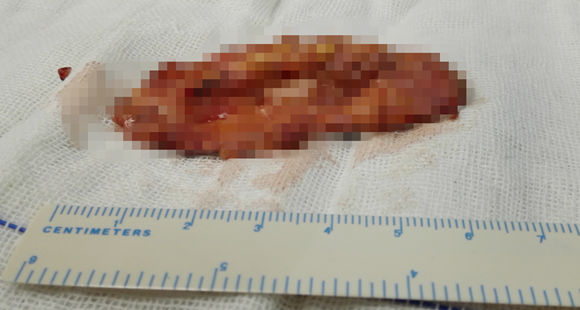 病人安全是我們的首要任務(wù),因此遵多學科會診意見,按照嗜鉻細胞瘤進行了規(guī)范的術(shù)前準備,2周后采取國際標準的腹腔鏡微創(chuàng)術(shù)式,手術(shù)發(fā)現(xiàn)左側(cè)腎上腺并無腫瘤但增大變厚。楊偉忠主任醫(yī)師術(shù)中判斷應(yīng)該是結(jié)節(jié)樣增生,于是將左側(cè)腎上腺完整切除。