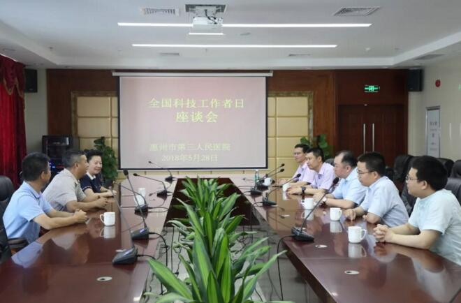 2018年5月28日下午,正值全國科技工作者日(5月30日)即將到來之際,惠州市科協(xié)王高橋副調(diào)研員、學(xué)術(shù)部周惠玲部長、魏貴洲主任科員等一行來到惠州市第三人民醫(yī)院東院區(qū),代表市科協(xié)慰問了武明鑫博士,為武明鑫博士送來了鮮花和慰問金,并與武明鑫博士等專家舉行了座談會。