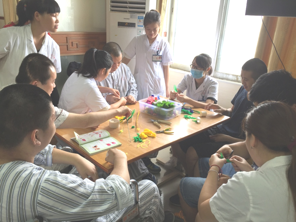 原來(lái),這里是惠州三院康復(fù)科門診的作業(yè)治療室,作業(yè)治療師們巧思妙想,舉辦了這次“絲網(wǎng)花”制作團(tuán)體治療活動(dòng)。這看起來(lái)是手工制作,卻可算是一種康復(fù)治療哦。