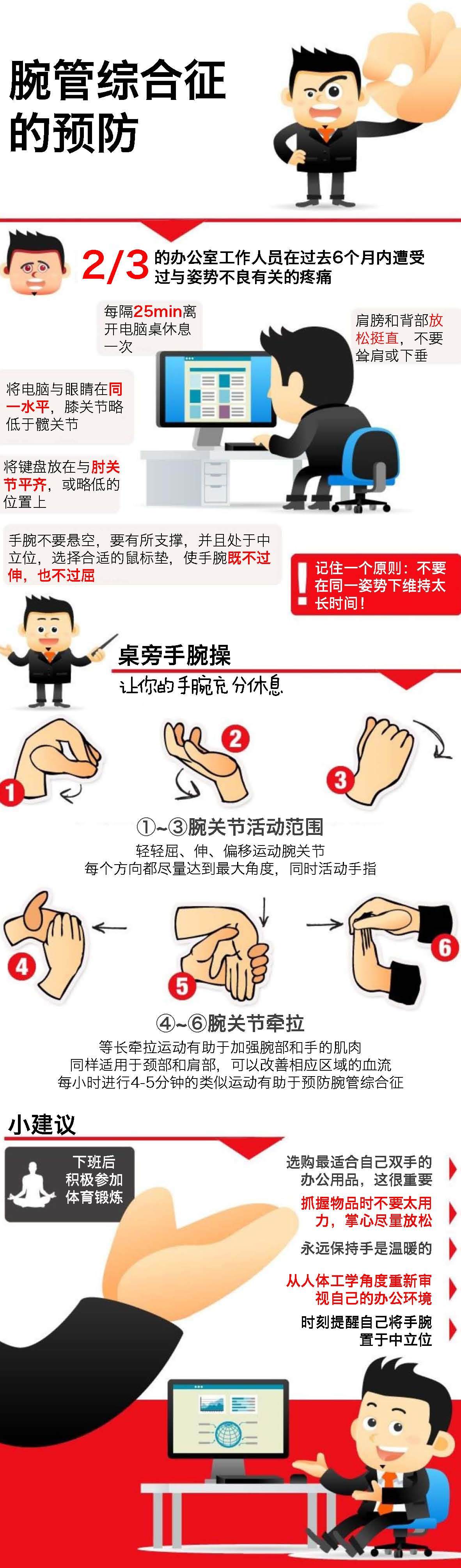 4.經(jīng)常伸展和松弛操作手,每工作1小時,可緩慢彎曲手腕10秒鐘。也可工作1小時,中間休息一下,做10秒鐘的握拳活動。每隔1小時,站起來休息一下,甩甩手,按摩一會兒手指,做一做握拳和放松動作,使手部各關節(jié)都能得到放松。