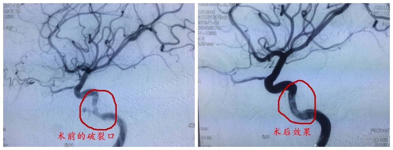 此次手術(shù)運(yùn)用新型覆膜支架植入技術(shù),具有血管內(nèi)膜覆蓋撕裂片的作用,能有效地防止血管內(nèi)膜破裂、動(dòng)脈瘤形成等并發(fā)癥。作為一項(xiàng)新的治療技術(shù),手術(shù)難度大、風(fēng)險(xiǎn)高,術(shù)中操作精度要求高,全國(guó)僅有少數(shù)大型醫(yī)院能夠?qū)嵤?,這也是我院開(kāi)展的首例該項(xiàng)技術(shù)。