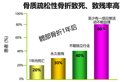 患骨質(zhì)疏松癥的老年人一旦發(fā)生跌倒,非常容易發(fā)生骨折。一旦骨折,后果將不堪設(shè)想。從下圖可以看到,髖部骨折后1年內(nèi),死于各種合并癥者達20%,存活者中約30%致殘,,不能自己獨立行走的也有40%,造成生活不能自理, 生命質(zhì)量明顯下降。