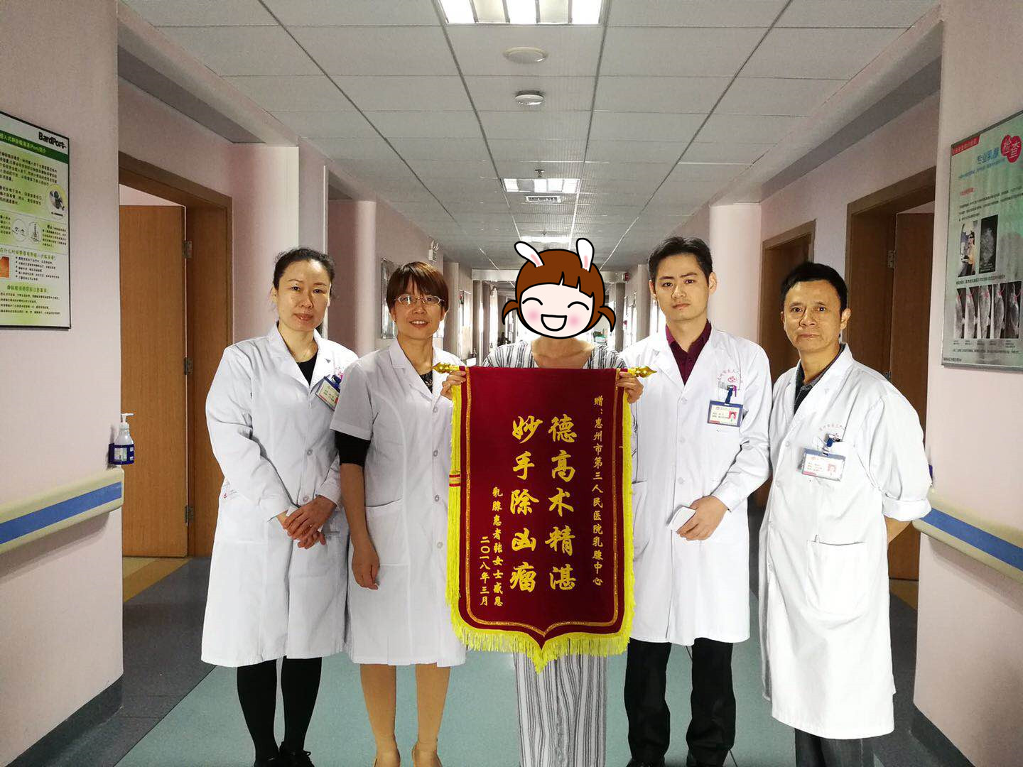 為表達感激之情,患者為乳腺中心醫(yī)生贈送錦旗(從右到左依次是張樹平主任、孫宇醫(yī)生、A女士、鄒燕鵬醫(yī)生、潘玉榮醫(yī)生)