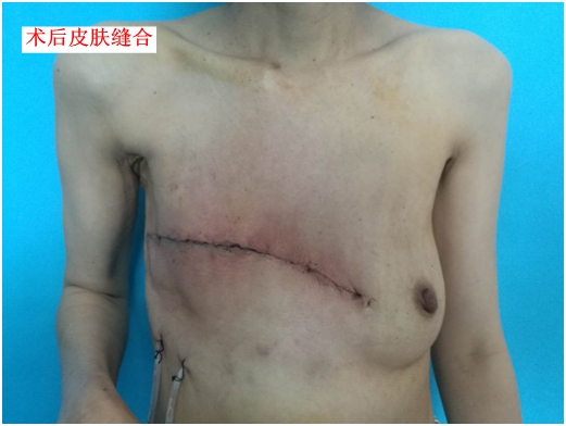 遭此病災(zāi)對患者來說是不幸的,可幸運的是手術(shù)做得非常成功,術(shù)中探查腋窩淋巴結(jié)無轉(zhuǎn)移,皮膚切緣均顯示陰性。利用患者的局部皮瓣,醫(yī)生將創(chuàng)面修復(fù)得整齊漂亮,讓患者徹底跟“巨乳”告別。