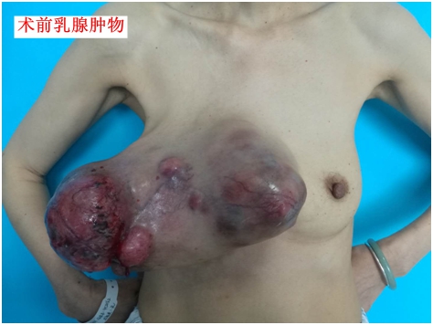 經(jīng)檢查,患者右側(cè)乳房被一個巨大腫物所占據(jù),就像一個不規(guī)則的大石塊,基本上看不到乳房的形狀,基底部還長到了對側(cè)乳房,大小約28 x15 x13cm?。。∧[塊皮膚血管充盈擴張,血運極其豐富,遠(yuǎn)端皮膚開始出現(xiàn)糜爛、滲血,患者也已經(jīng)處于貧血狀態(tài)。