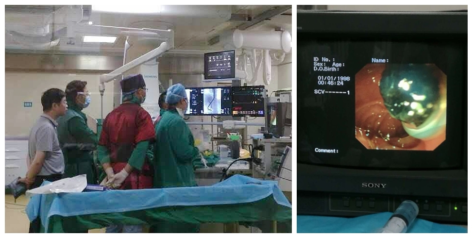 家屬聽到醫(yī)生話后心情淡定了,選擇相信醫(yī)生。同意進(jìn)行手術(shù)治療。做好術(shù)前準(zhǔn)備后,我們把阿婆送到介入室進(jìn)行手術(shù)治療。在曾紅文科主任積極組織協(xié)調(diào)下,由肝膽外科李慧華主治醫(yī)生在為阿婆進(jìn)行的無(wú)切口手術(shù)——ERCP(內(nèi)鏡逆行胰膽管造影)術(shù)。