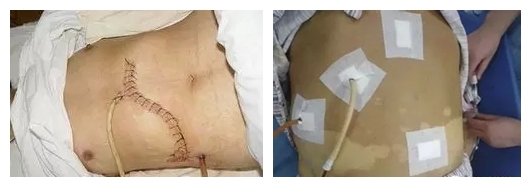 再回頭看看以前的開腹膽總管結(jié)石手術(shù)切口引流情況和腹腔鏡膽總管結(jié)石切口及引流情況。