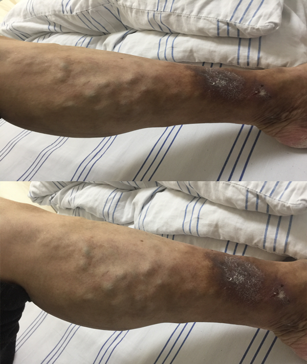 患者吳先生來到醫(yī)院時,左下肢已經(jīng)破潰,右下肢上也有彎彎曲曲的蚯蚓狀凸起。這都是由靜脈曲張引起的。