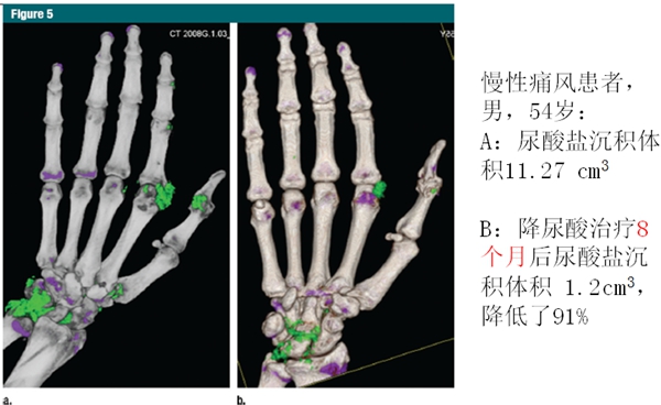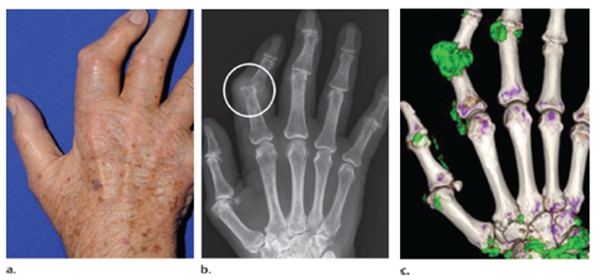 如圖所示圖,a是肉眼看到的手,圖bX光拍攝到的影像,而圖c中的綠色物質(zhì)就是尿酸鹽,通過CT可以計(jì)算出沉淀在血管外的尿酸鹽,且可以判斷痛風(fēng)的治療效果。