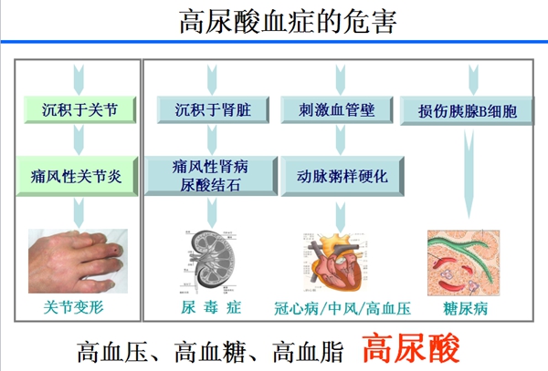 以前,人們總是過于夸大食物在高尿酸血癥和痛風(fēng)形成的作用,實(shí)際上,這是因?yàn)榛颊唧w內(nèi)尿酸的生成與排泄環(huán)節(jié)存在問題,而食物只是壓垮駱駝的最后一根稻草。而且,尿酸高了,就算沒有關(guān)節(jié)痛,但是長(zhǎng)期的高尿酸也會(huì)導(dǎo)致一系列嚴(yán)重的后果,比如說高血壓、糖尿病。這樣一來,冠心病、中風(fēng)、腎衰竭就會(huì)跟著發(fā)生。所以說,單純飲食控制,只能控制20%的尿酸,對(duì)導(dǎo)致痛風(fēng)發(fā)作的那80%的尿酸卻無能為力,必須依靠藥物治療來降低。