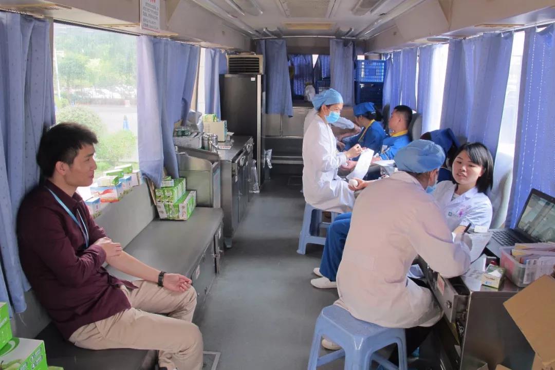 工作人員給獻(xiàn)血的職工們測量血壓、測量心率、詢問體重并進(jìn)行采血樣的檢測