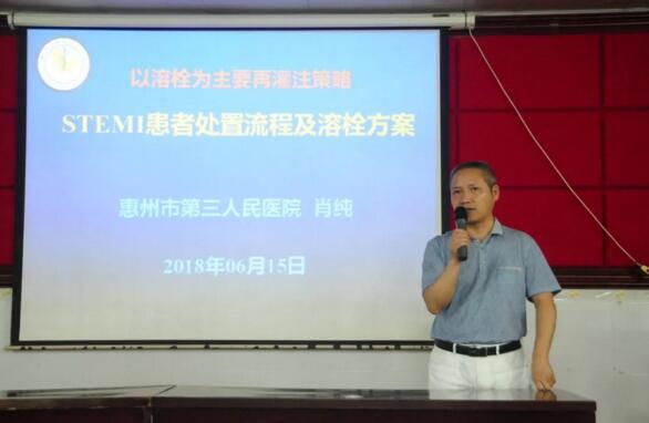 為進(jìn)一步提升基層醫(yī)療衛(wèi)生機(jī)構(gòu)對(duì)胸痛中心的認(rèn)識(shí),提高醫(yī)務(wù)人員的救治能力,以及時(shí)、規(guī)范救治急性心肌梗死等胸痛疾病患者,2018年6月15日,惠州市胸痛中心聯(lián)盟執(zhí)行主席,惠州市第三人民醫(yī)院副院長(zhǎng)、心血管醫(yī)學(xué)中心主任肖純博士,應(yīng)邀帶隊(duì)前往龍門縣人民醫(yī)院指導(dǎo)該院胸痛中心建設(shè)工作,并為該院及相關(guān)基層醫(yī)療機(jī)構(gòu)醫(yī)務(wù)人員開(kāi)展了相關(guān)業(yè)務(wù)培訓(xùn)?;葜萑盒难茚t(yī)學(xué)中心副主任鐘思干主任醫(yī)師、醫(yī)務(wù)部郭建兵主任、社工部李穎紅主任也隨同與醫(yī)務(wù)人員們進(jìn)行了深入交流。