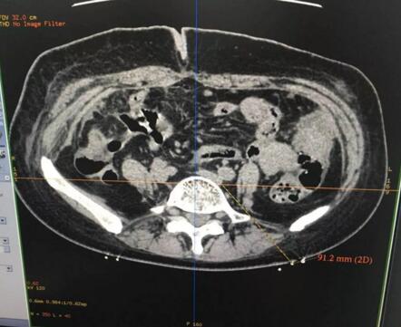手術(shù)當(dāng)日,在放射科全力配合下,王鑫主治醫(yī)師順利完成了CT引導(dǎo)下上腹下神經(jīng)叢毀損術(shù)。術(shù)中采用“雙針會(huì)合法”,雙側(cè)穿刺針在CT精準(zhǔn)導(dǎo)航下達(dá)腹主動(dòng)脈兩側(cè),造影劑注射掃描見(jiàn)造影劑彌散良好,利多卡因阻滯試驗(yàn)?zāi)芨采w疼痛區(qū)域,注射10ml無(wú)水乙醇進(jìn)行神經(jīng)毀損……