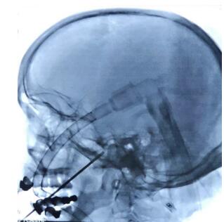 在C形臂引導(dǎo)下經(jīng)嘴角外側(cè)穿刺進(jìn)入卵圓孔,將球囊導(dǎo)管送至半月神經(jīng)節(jié),充盈球囊,壓迫數(shù)分鐘,破壞神經(jīng)傳導(dǎo),達(dá)到治療目的。