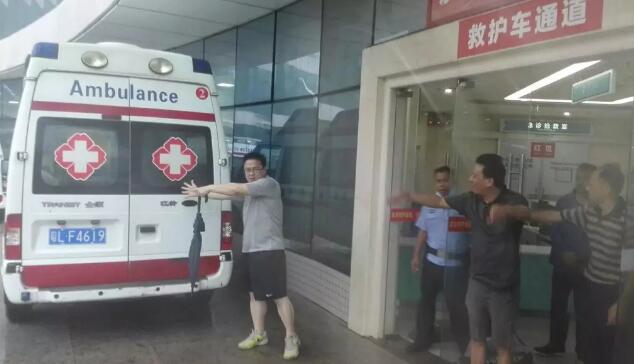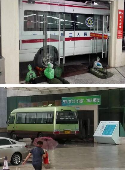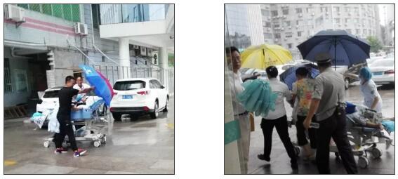 早上8點(diǎn)開始,工作人員就用防汛沙袋固定兩院區(qū)的玻璃門,當(dāng)上午10時(shí)許風(fēng)力增大時(shí),沙袋已不能滿足防風(fēng)需求,為防止玻璃門破碎,大家便將救護(hù)車及中巴車停在急診科和2號(hào)樓門前,為進(jìn)風(fēng)量大的玻璃門遮風(fēng)擋雨,并安排保安人員留守,隨時(shí)發(fā)現(xiàn)異常情況。同時(shí),保潔人員及時(shí)處理吹進(jìn)來的雨水。
