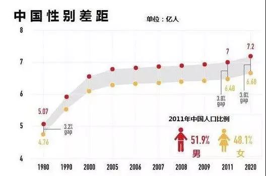 此后幾年,出生人口男女比例一直處于117-121之間。2001年出生的男女比例為118.45,男生比女生多出120萬;2002年出生的男女比例為118.9。而到了2009年,出生人口男女比例達(dá)到了121.06,男生為858萬,比女生多出150萬。2000年出生的00后,現(xiàn)在正好18歲,再過兩年,他們也將陸續(xù)進(jìn)入適婚年齡。然而,根據(jù)國家人口普查年鑒數(shù)據(jù)顯示,2000年出生的人口,男女比例大概為118.23:100,其中男生783萬,女生662萬,男生比女生多121萬。